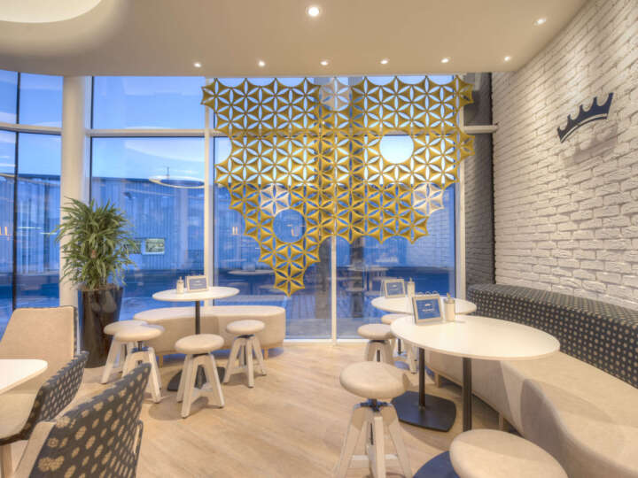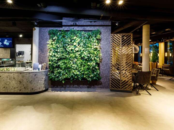 Natürliche und nachhaltige Fasern wie Holz, Myzel oder recycelte Textilien werden zu Wand- und Deckenpaneelen verpresst und schaffen eine deutlich ruhigere und angenehmere Atmosphäre. Auch schallabsorbierende Oberflächen an Thekenfronten, Raumteilern, multifunktionalen Deckensegeln und Bildern verbessern die Akustik. Selbst mit Filz oder Stoff bezogene Stühle, Sessel und Sitzbänke reduzieren gegenüber Oberflächen aus Kunstleder den Raumschall.
