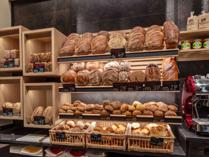 Leistungen AICHINGER: Standortberatung, Entwurfs- und Ausführungsplanung, begleitende Baukoordination, Lieferung und Einbau Theken (2 ,40 lfm, davon 0,50 lfm gekühlt), Mobiliar und Brotregal PANEVARI®