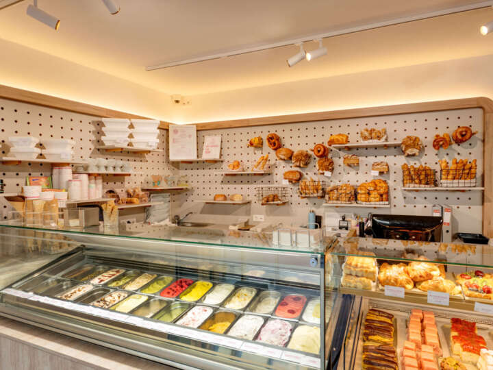 Die Mehlspeisen, Kuchen und Torten werden in der Theke ARTline präsentiert. Daneben und in direkter Blickachse und Laufrichtung steht die Eistheke. Die 26 GN-Behälter werden im Winter herausgenommen und die Eistheke wird für die Präsentation von Keksen, Backwaren und Schokoladenspezialitäten genutzt.