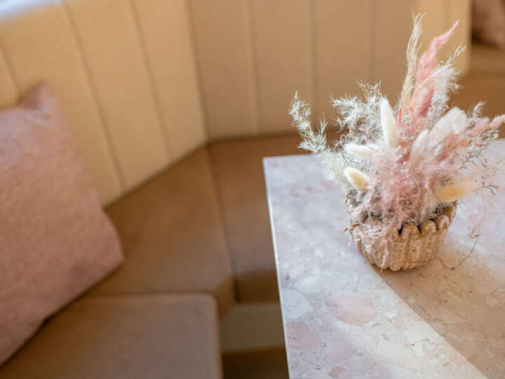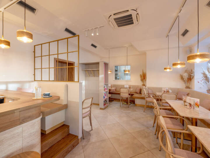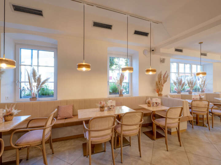 Für Barbara Kadlec war schnell klar, dass für die vielen Stammgäste Bekanntes fortzuführen war. Rosa in verschiedenen Nuancen dominierte früher das Kaffeehaus. Nun sind die Sitzkissen auf den Bänken in Rosa und die Sitzpolster der Kaffeehausstühle mit Wiener Geflecht Rosé-Beige gehalten. Die Shop-Designer von AICHINGER rund um Christoph Sindlgruber haben bei den Oberflächen der Thekenanlage, der Fliesen, der Tischplatten und der Sitzbänke helle Erdtöne mit Karamell und Holz akzentuiert.