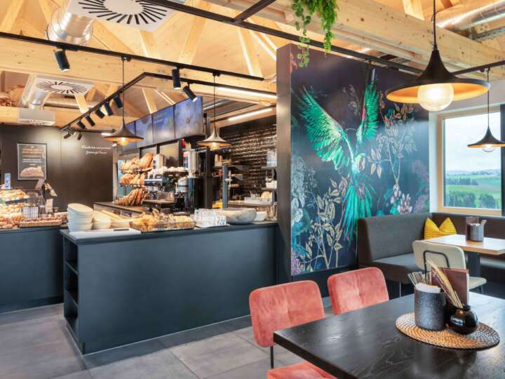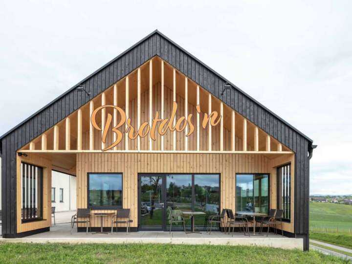 Altenfelden, im oberen Mühlviertel gelegen, zählt nur 2.500 Einwohner, ist aber wegen der zentralen Lage im Dreiländereck Österreich, Deutschland, Tschechien ein sehr guter Einzelhandelsstandort: Ein inhabergeführter Eurospar-Markt und eine Hofer-Filiale schaffen Frequenz – nun auch für den Standort der Mühlviertler Landbäckerei (MLB). Christoph Filipp, Geschäftsführer der Bäckerei Filipp und Chef der Mühlviertler Landbäckerei hat in den Grundstückserwerb, den Bau und in die hochwertige Gestaltung des Freestanders investiert. Die an allen Standorten kommunizierten Werte der Bäckerei – Heimat, Handwerk & Herzlichkeit – werden dort besonders sicht- und erlebbar. Ein Holzgebäude mit einer Sichtschalung aus hell und dunkel gebeiztem Holz außen und einem Sichtdachstuhl innen.