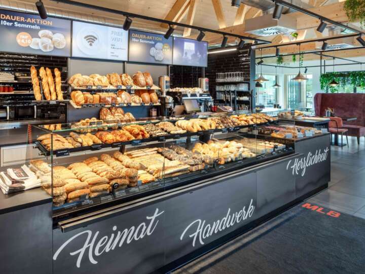 Im Fokus steht dennoch immer die Theke: In Altenfelden eine 4,70 m lange ARTline mit festem Zwischenboden. Das schafft Warendruck für das Kleingebäck in der Theke. Beidseitig ist die Theke zur Ausgabe abgesenkt. Markant sind in allen Filialen die mit Metallplatten bekleidete Thekenfront und die schwarzen Fliesen in Metro-Stil hinter dem Brotregal. Das Brotregal ist mit 1,35 lfm und zwei Etagen recht kompakt gehalten. Bewusst, denn das Brotregal wird nachbestückt und ist deshalb auch bis in die Abendstunden gut gefüllt. Der Ladenbackofen ist sehr sichtbar neben dem Brotregal positioniert. Für Christoph Filipp, Geschäftsführer Mühlviertler Landbäckerei, Ausdruck sicht- und erlebbarer Frische beim Kleingebäck.