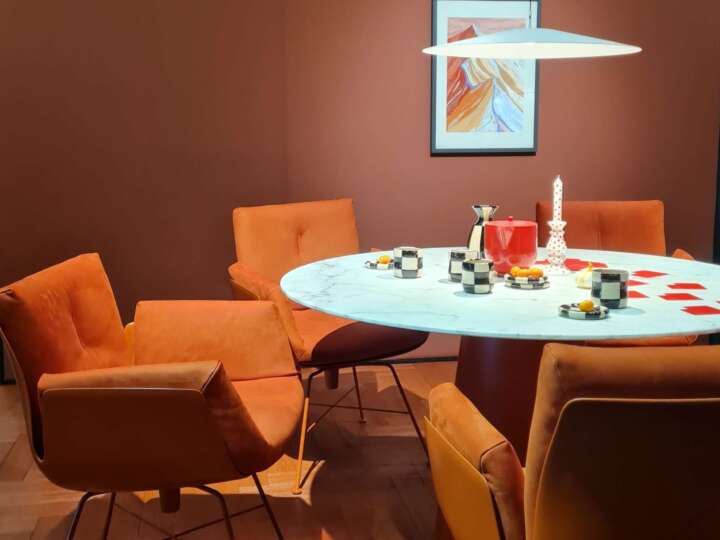 Optisch darf es im Jahr 2024 farbenfroh bleiben – allerdings sind die Farben, die man in den aktuellen Shop-Design-Katalogen und auf den Möbelfachmessen sieht, nicht mehr so knallig und schrill, wie noch vor einem Jahr. Sanfte und gedeckte Farben sowie Naturtöne sind auf dem Vormarsch – von Blaugrau über Algengrün bis hin zu Schokoladenbraun und Apricot. Eine Neuheit: selbst die Stahlgestelle der Stühle sind mittlerweile farbig gepulvert und das Holz dazu in demselben Ton gebeizt.