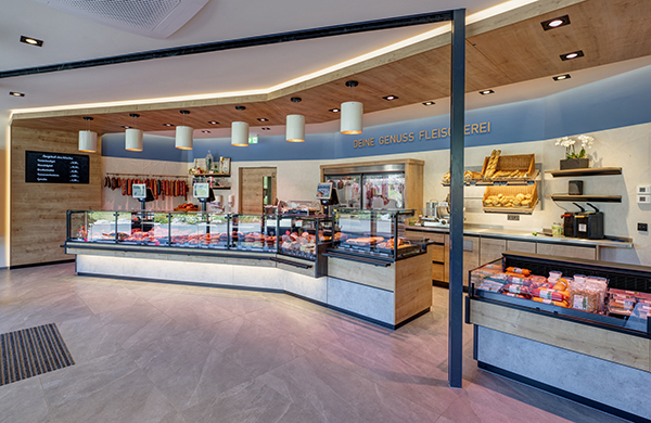 Die Metzgerei Höller hat sich für eine zukunftsweisende Solekühlung entschieden. Dabei fließt die Sole direkt durch den Wärmeübertrager und es werden keine Expansionsventile benötigt. Dazu wird eine sehr geringe Menge an Kältemittel – und diese nur außerhalb des Ladengeschäfts – benötigt, um die Sole zu kühlen.