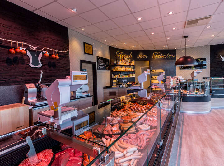 In den Metzgereien sind Metall und Stahl bei den AICHINGER-Kund:innen die ungeschlagen beliebtesten Materialen. Kombiniert werden Metall und Stahl gerne mit Rottönen und Piktogrammen, zum Beispiel von Stieren und Schweinen.