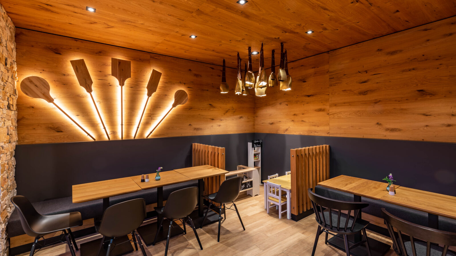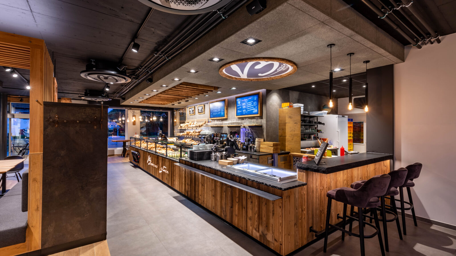 Die neueste Filiale der Bäckerei Leitner in Nußdorf am Inn bekam von uns ein urig-modernes Facelift. Die warme, einladende Atmosphäre erhält der großzügig gestaltete Raum durch die dominierenden Holzelemente, die sowohl bei der Gestaltung der Theke, als auch bei der Wand- und Decke Platz fanden. Flankiert wird das Holzensemble von der dunklen Arbeitsplatte aus Granitstein und der grauen Decke in Betonoptik. Heimeliges Hüttenambiente par excellence.