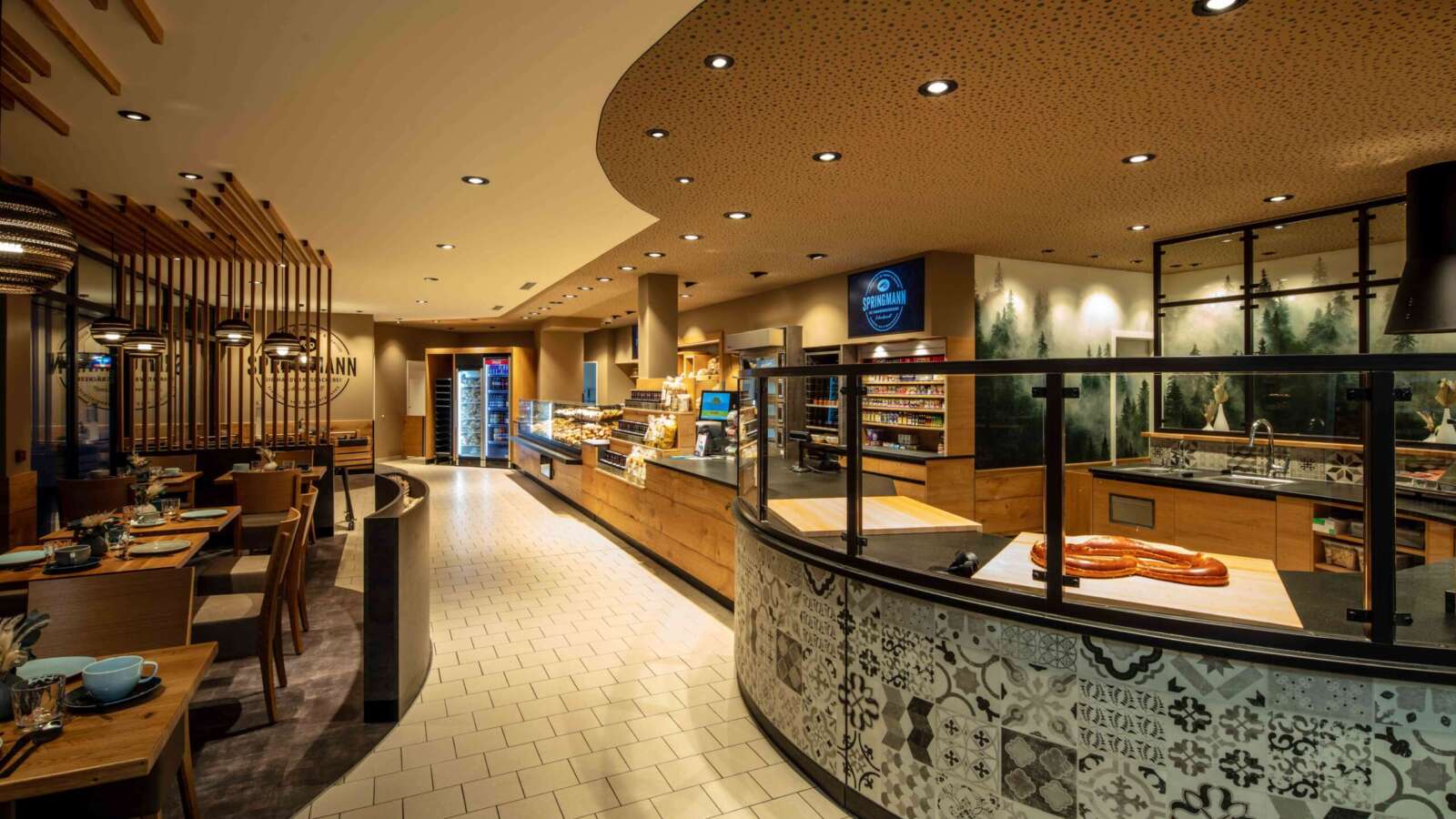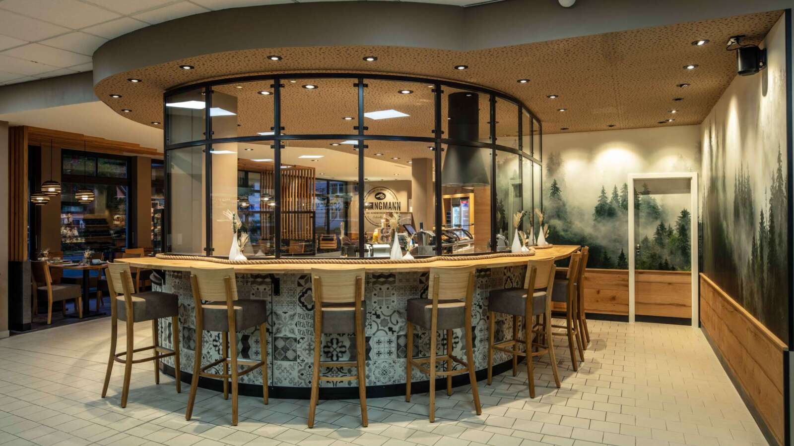 Naturbelassenes Holz in Kombination mit Wald-Print Motiven im Essbereich sorgen für eine harmonische und entspannte Atmosphäre bei der Bäckerei Springmann. AICHINGER begleitete den Umbau im Stadtzentrum in Schenkenzell: Auf den 150m² entstand eine moderne Showbäckerei mit Café mit einem ganz besonderen, warmen Ambiente!