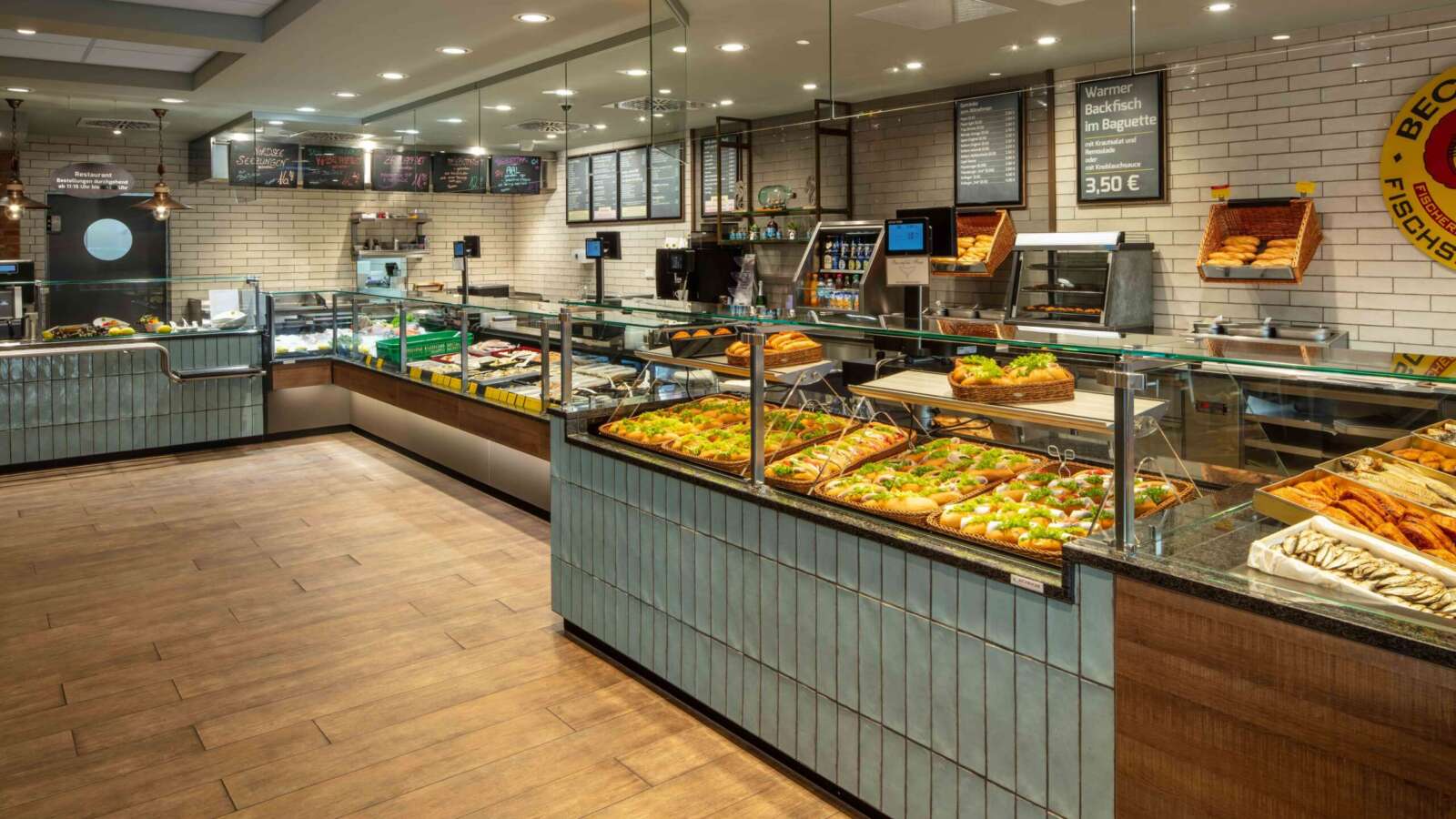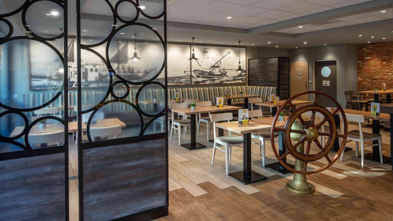 Bei Beckmann Fischspezialitäten in Büsum gibt es köstlichen Fisch und Meeresfrüchte fangfrisch direkt aus der Nordsee. Das Lokal des Familienbetriebs begeistert mit seinem außergewöhnlichen Mix aus Holz, Feinsteinzeug, Metall und klassischen Schiffselementen. Das maritime Farbkonzept unterstreicht zusätzlich die Herkunft des traditionellen Fischfangs.