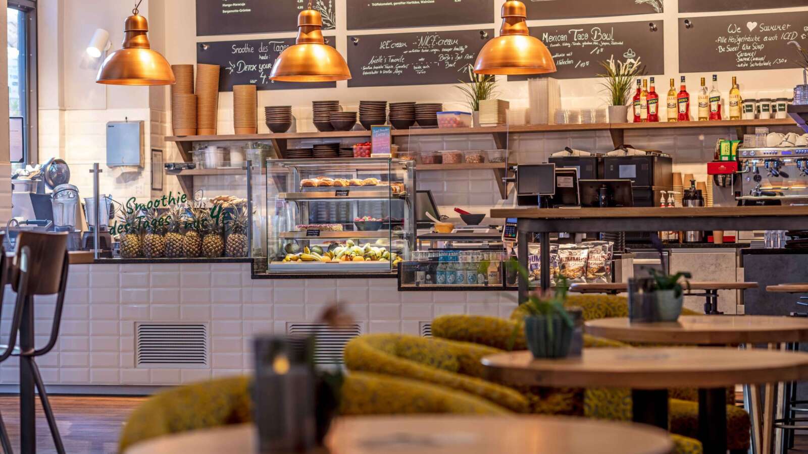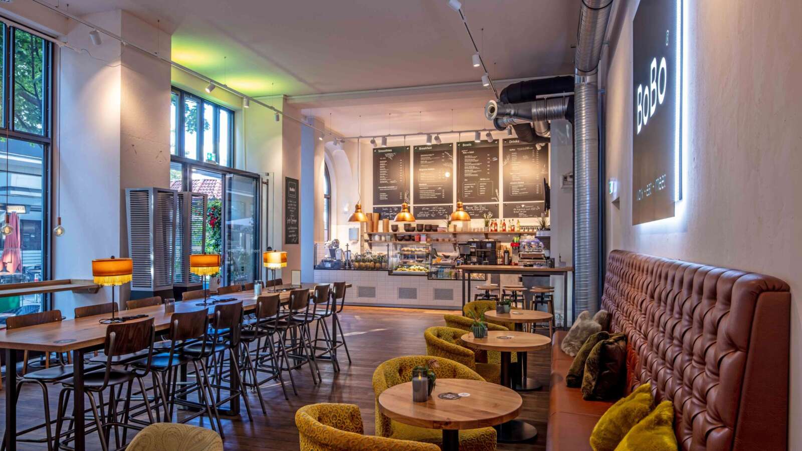 Eat – Meet – Work: Im Café Bobo in Hannover vereinen wir modernes Coffeeshop-Design mit hipper Coworking-Space Atmosphäre. Im Thekenbereich unterstreichen weiße Metro-Fliesen und kupferfarbene Leuchten den Industrial-Vintage-Mix und sorgen für Übersichtlichkeit und optimale Bedingungen für ansprechende Produktpräsentation.