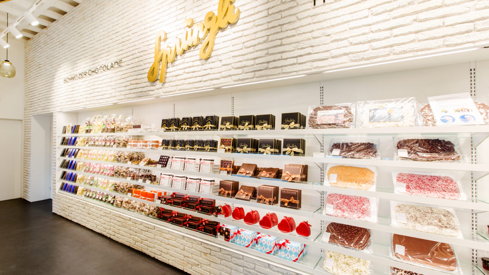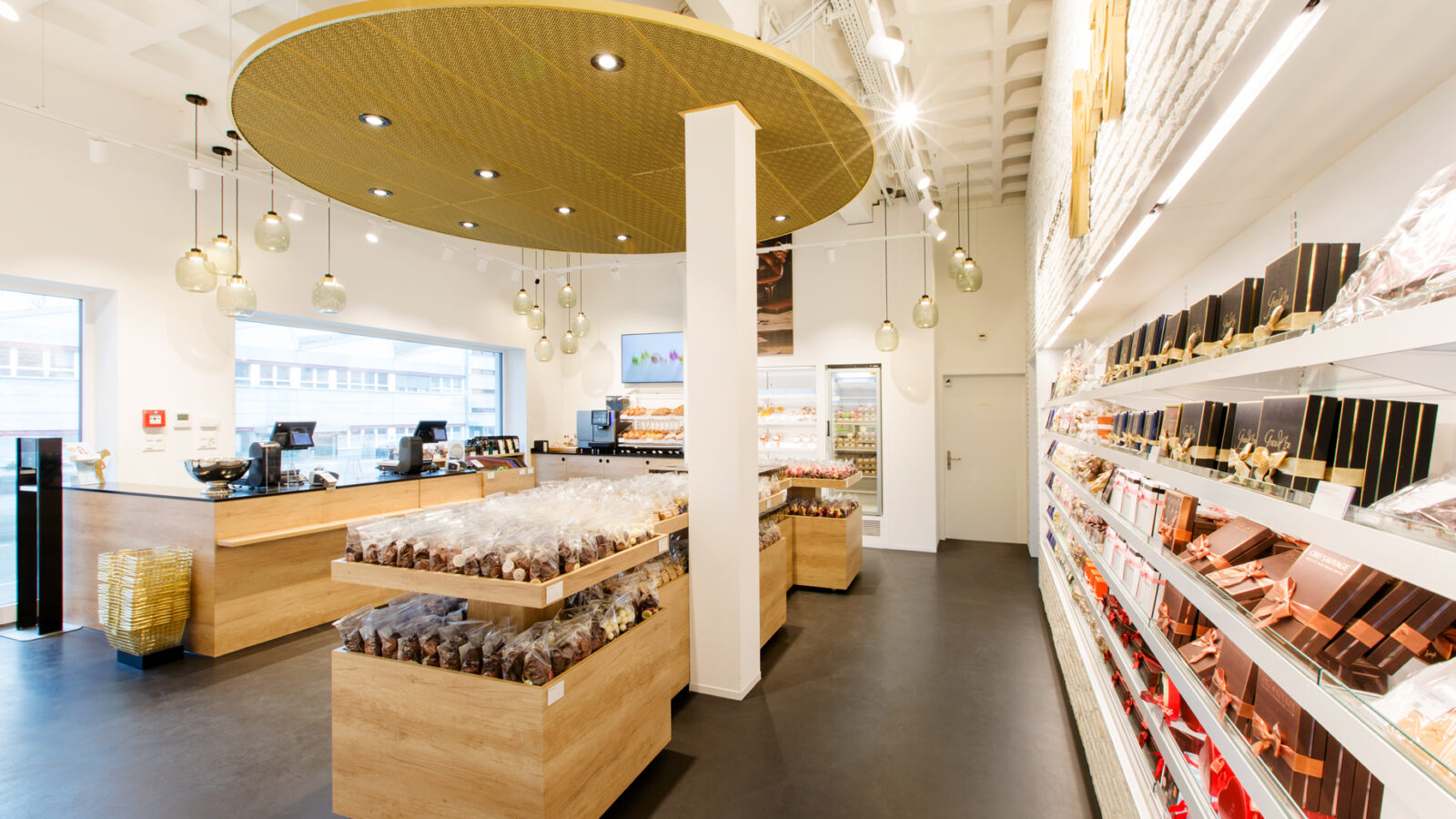 Das erste Schokoladen-Outlet der Confiserie Sprüngli lockt auf rund 70 m² mit hauseigenen Spezialitäten aus der angrenzenden Manufaktur. Weiße Backsteinwände, helles Holz und ein elegantes Beleuchtungskonzept schaffen ein modernes, luftiges Ambiente und verhelfen dem Raum optisch zu mehr Größe. Die goldenen Designakzente verleihen dem Outlet seine exklusive Eleganz und greifen dabei auch das Corporate Design der Traditions-Confiserie auf.