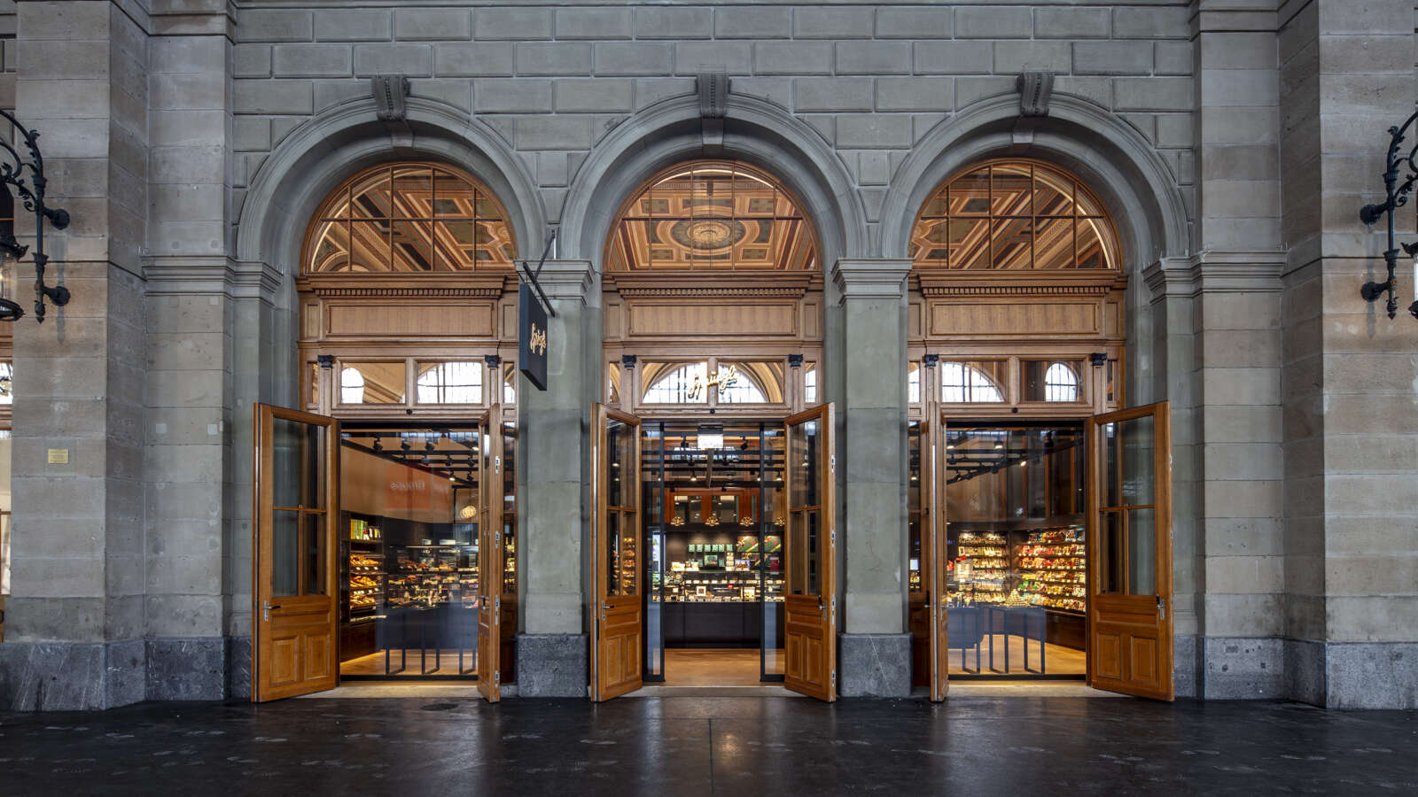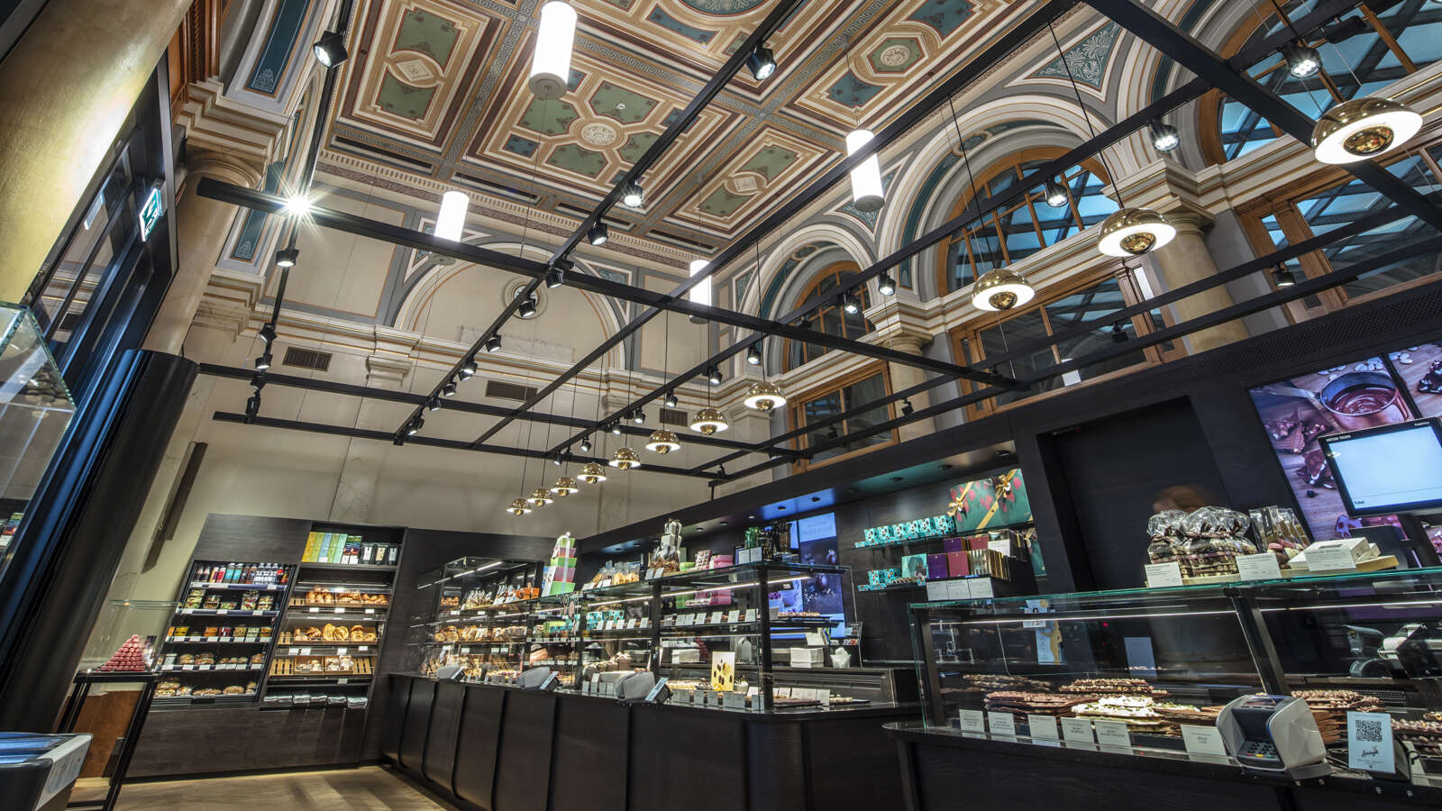 Die Confiserie Sprüngli zählt zu den angesehensten Confiserien Europas und gehört zu den Schweizer Pionieren der Haute Chocolaterie. Der Filiale am Hauptbahnhof in Zürich durfte AICHINGER nun zu neuem Glanz verhelfen. Nach dem Umbau findet sich die Filiale nun in einem denkmalgeschützten Raum im Südtrakt des Bahnhofs wieder – unter der Decke aus dem Jahre 1871 entfaltet die Confiserie ihre volle Pracht. AICHINGER hat beim Umbau die Baukoordination übernommen und maßgeschneiderte Einrichtungslösungen realisiert.