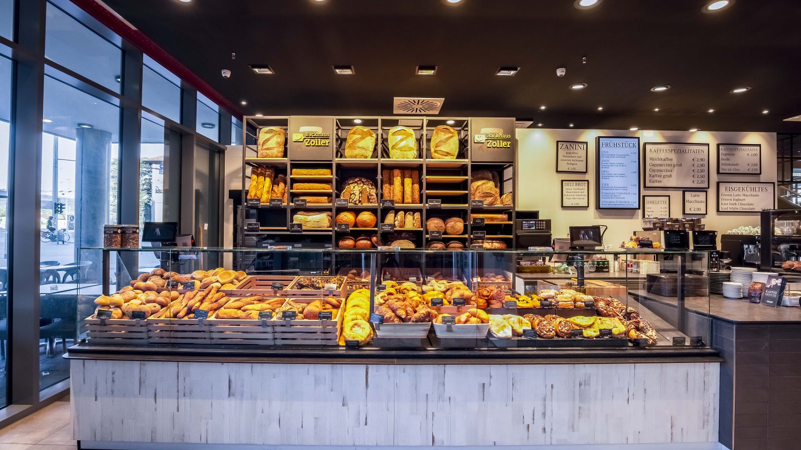 Der Name ist Programm. Das „ESszimmer“ steht für ein 300 m²-Loft mit eindrucksvollem Sitzbereich inklusive Panoramablick auf den neu gestalteten Esslinger Bahnhofsplatz. Auf über 12-Metern Bedientheke gibt es Fleisch und Wurstwaren von Häfele sowie frisch zubereitete Backwaren vom Backhaus Zoller – alles perfekt in Szene gesetzt. Außerdem bietet die Bäcker-Metzger-Kombination einen umfangreichen Imbiss für mittags.