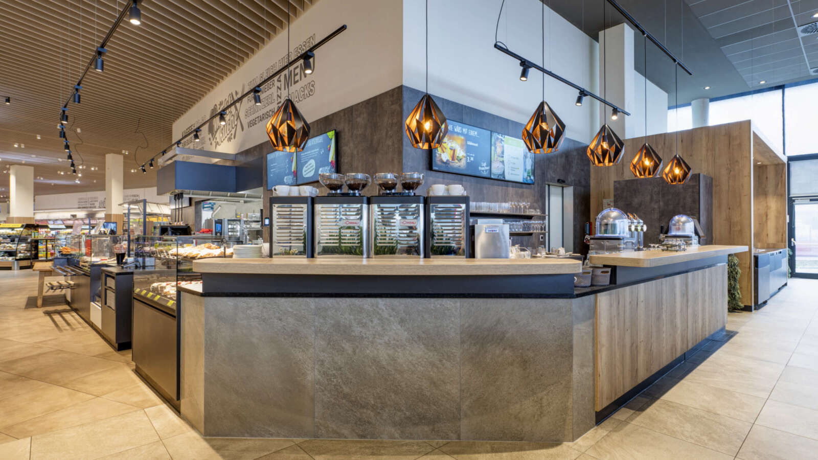 Nicht bloß nur ein Lebensmittelgeschäft, sondern auch noch Café und Restaurant inklusive Schauküche: Der EUROSPAR in Pöchlarn ist das Flaggschiff der Prauchner GmbH. Beim großangelegten Um- und teilweisen Neubau der Filiale durften wir den kompletten Imbiss- und Bäckerbereich samt Sitzbereich und Bartheke neu gestalten. Eine großzügige Imbisstheke mit TopSpot MIO+-Kühlmöbeln lädt die Kunden zur Selbstbedienung ein und dient als perfekte Schnittstelle zwischen LEH-Markt und Café beziehungsweise Restaurant. Warme Speisen werden energiesparend und optimal auf den Platten 64 & 74 präsentiert. Sowohl im Imbiss- also auch im Bäckerbereich rückte unsere Theke ARTline die Lebensmittel perfekt in den Fokus.
