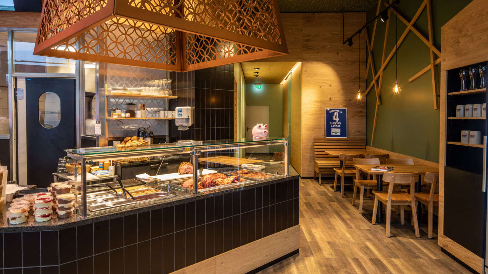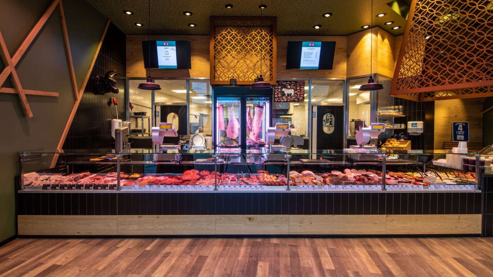 Mit dem Umzug ist auf rund 400 m² eine beeindruckende Fleischerei samt gläserner Produktion entstanden. Hier können Kunden die Herstellung der hauseigenen Spezialitäten live durch eine Glaswand verfolgen. Trendiges Grün, warmes Holz und auffällige, verspielte bronzefarbene Stahlelemente verleihen dem Verkaufsraum dabei seinen designstarken, zeitgemäßen Charakter.