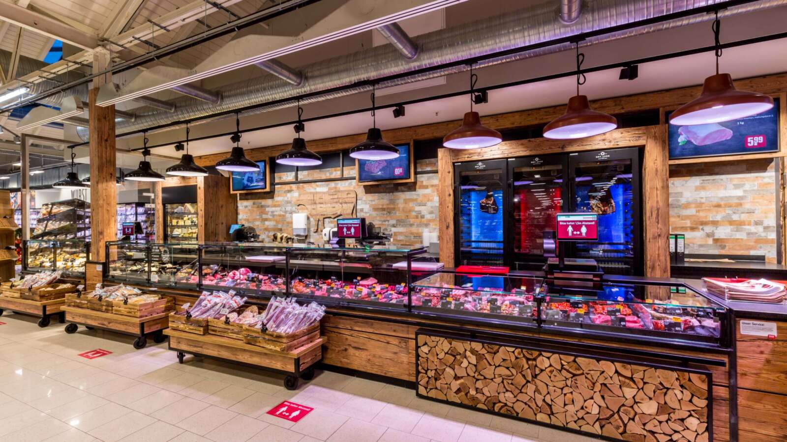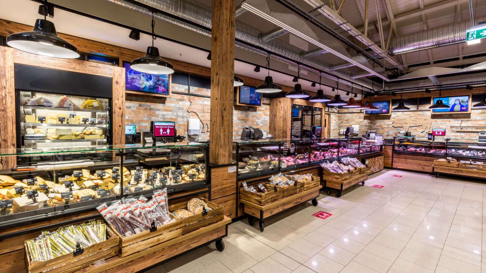 Geschichtsträchtig Einkaufen bei REWE Stanisic in Freising. In den Hallen der historischen Freisinger Motorenfabrik Anton Schlüter entstand mit viel Liebe zum Detail ein moderner Supermarkt. Der eindrucksvolle industrielle Charme der ehemaligen Produktionshallen wurde dabei erhalten und um modernsten Einkaufskomfort ergänzt.