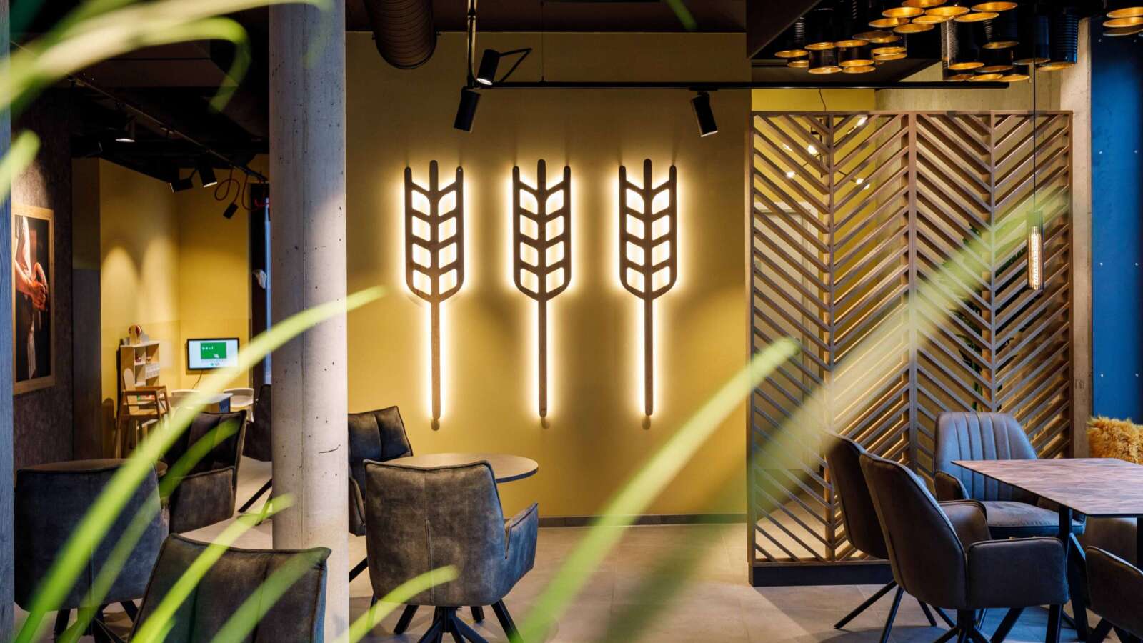 Seit mehr als 100 Jahren steht die Steinofenbäckerei Bopp für Handarbeit und die Liebe zum Detail. Beim Umbau der Filiale in Laichingen haben wir daher auch beim Shop-Design auf viele liebevolle Details gesetzt. Die beleuchteten Ähren im Sitzbereich und begrünte Wände unterstreichen die Naturverbundenheit und die lange Handwerkstradition des Familienbetriebs. Der Sitzbereich wirkt durch die warmen Gelb- und Brauntöne sehr gemütlich. Die frischen Backwaren kommen in unserer Theke ARTline besonders gut zur Geltung. Die vielen Brotsorten der Bäckerei werden in unserem flexiblem Brotregal PANEVARI® optimal in Szene gesetzt.