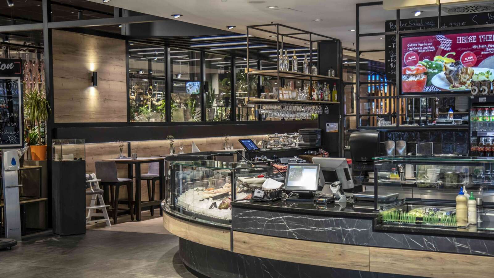 Eine der kulinarischen Top-Adressen im Ruhrgebiet ist Zurheide Feine Kost. Ein umfangreiches Frischeangebot und das exzellente Restaurant in der Vorkassenzone machen den Lebensmittelmarkt zum Anlaufpunkt für Kund:innen, die nicht nur Quantität, sondern auch Qualität in Sachen Lebensmittel schätzen. Beim Umbau der Filiale in Oberhausen stand für die Betreiber ein Konzept im Vordergrund, das den Markt in jeglicher Hinsicht fit für die Zukunft machen soll. AICHINGER durfte dabei den kompletten Frischebereich samt der offenen Vorbereitungsräume gestalten und den Thekenbereich des Restaurants inklusive der offenen Küche designen und planen. Eine Kombination der Kühlmöbel SIRIUS®3 und TopSpot MIO+ setzen die exquisiten Waren im Frischebereich verkaufsstark in Szene. Im Restaurant zieht unsere Kühltheke SIRIUS®3 in der geschwungenen Variante „Swing“ alle Blicke auf sich. Unsere Salatbar FreshMaxx 2 und unsere Gastrotheke GOURMET sorgen dafür, dass der Gaumenschmaus auch zum Augenschmaus wird.